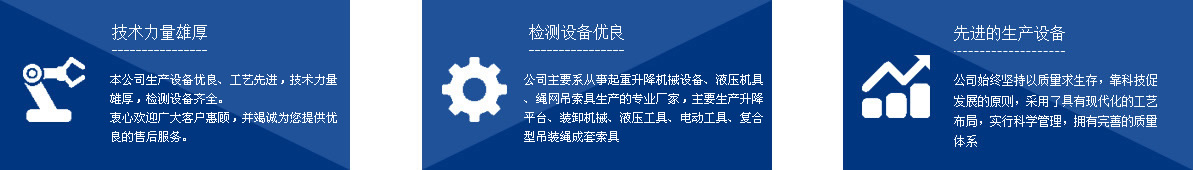 本公司系從事起重升降機(jī)械設(shè)備、液壓機(jī)具、繩網(wǎng)吊索具生產(chǎn)的專業(yè)廠家,主要生產(chǎn)千斤頂、液壓拉馬、軸承加熱器、升降平臺、裝卸機(jī)械、液壓工具、電動工具、復(fù)合型吊裝繩成套索具、高強(qiáng)纖維柔性吊裝帶、起重鏈條成套索具、橫梁吊具、注塑繩、軟梯、安全帶、安全網(wǎng)等幾大系列、上百種規(guī)格的產(chǎn)品,廣泛應(yīng)用于電力、油田、大型鋼廠、機(jī)電、化工、航空、冶金、機(jī)械、鐵道、造紙、港口、建筑等領(lǐng)域。